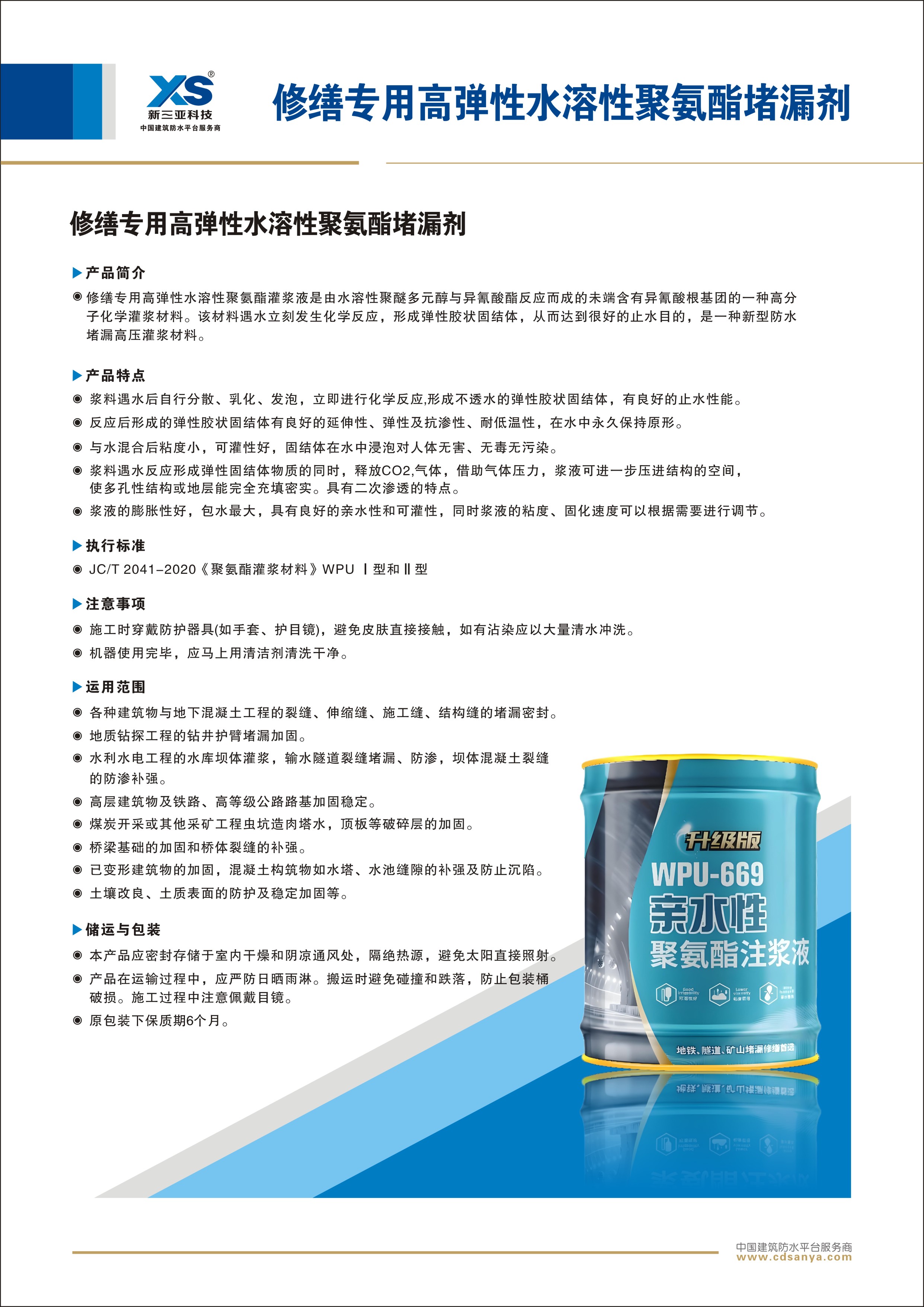 WPU-669水溶性聚氨酯灌漿液是由水溶性聚醚多元醇與異氰酸酯反應(yīng)而成的未端含有異氰酸根基團(tuán)的一種高分子化學(xué)灌漿材料。該材料遇水立刻發(fā)生化學(xué)反應(yīng),形成彈性膠狀固結(jié)體,從而達(dá)到很好的止水目的,是一種新型防水堵漏高壓灌漿材料。