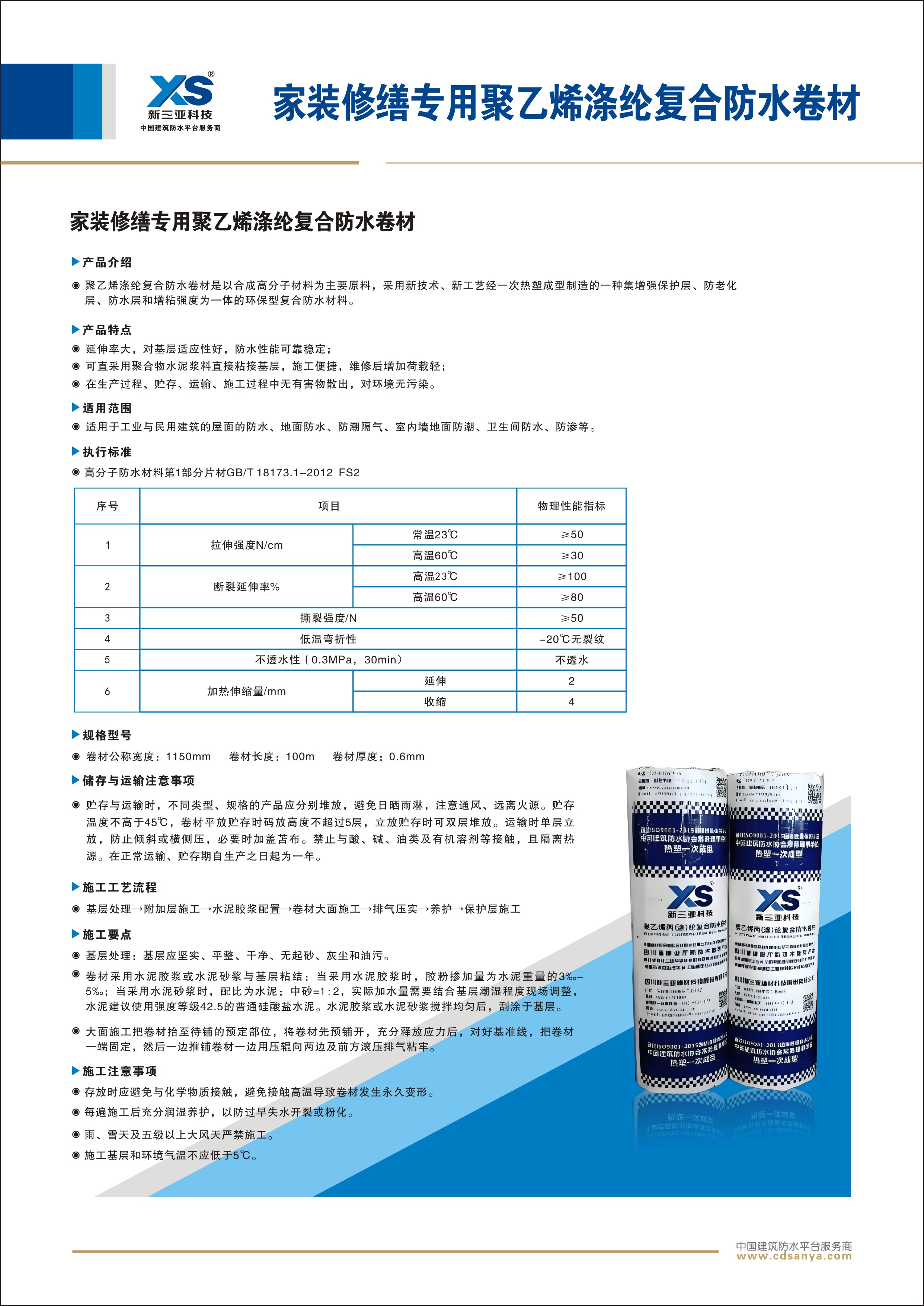 家裝修繕專用聚乙烯滌綸復(fù)合防水卷材是以合成高分子材料為主要原料,采用新技術(shù)、新工藝經(jīng)一次熱塑成型制造的一種集增強(qiáng)保護(hù)層、防老化層、防水層和增粘強(qiáng)度為一體的環(huán)保型復(fù)合防水材料。
