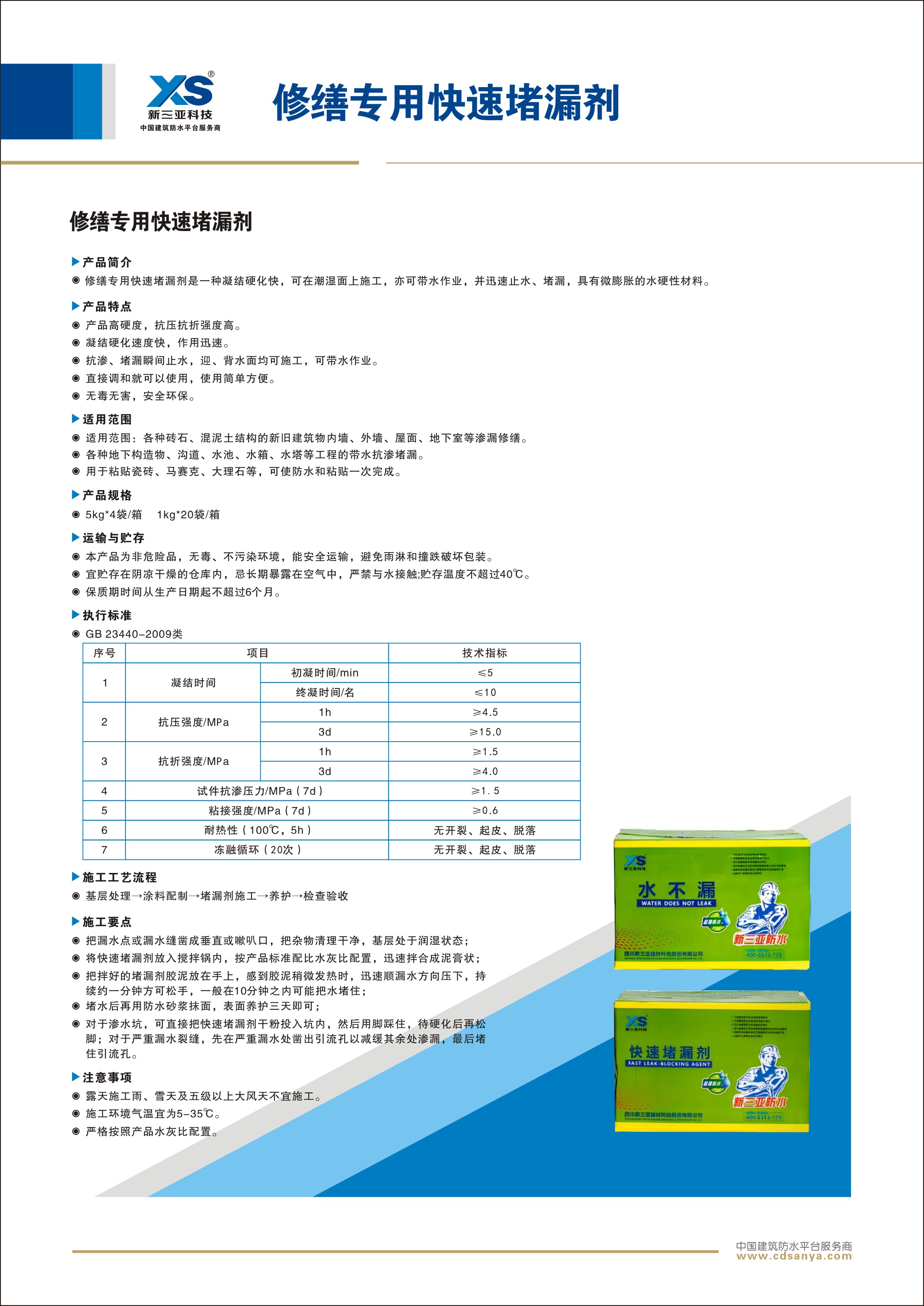 2、堵漏速度快、 強(qiáng)度高、 有微膨脹性, 抗?jié)B性高。