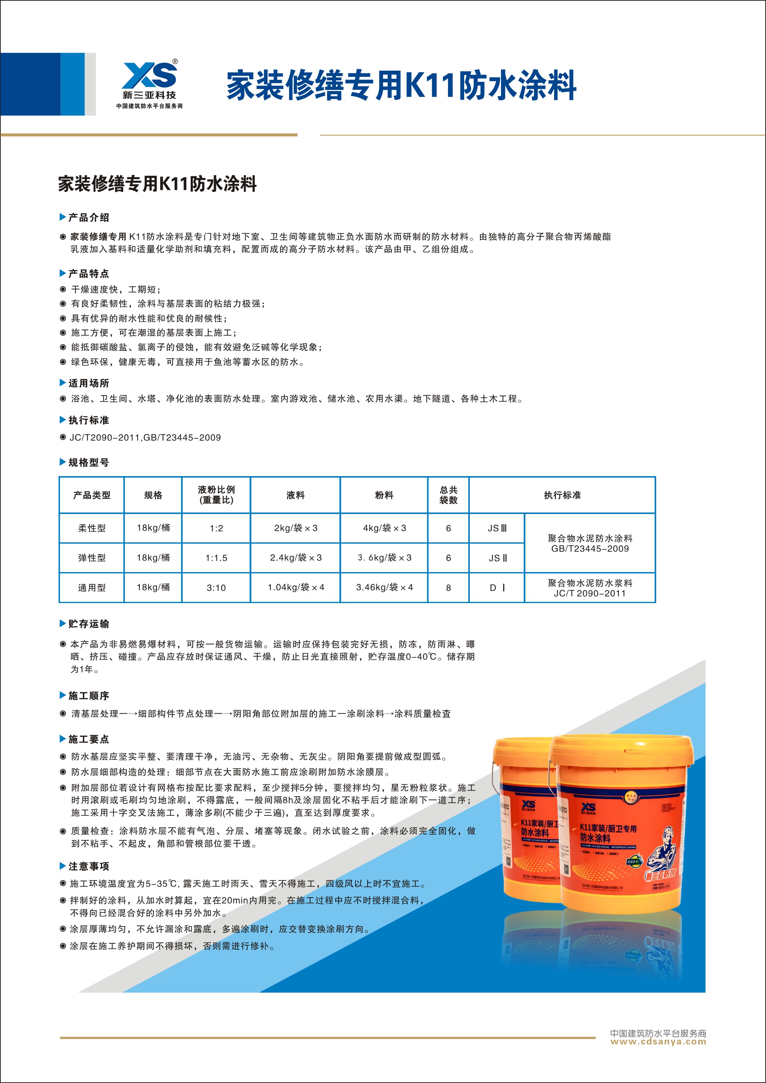 產(chǎn)品簡介: 家裝修繕專用K11防水涂料是專門針對地下室、衛(wèi)生間等建筑物正負(fù)水面防水而研制的防水材料。由獨(dú)特的高分子聚合物丙烯酸酯乳液加入基料和適量化學(xué)助劑和填充料,配置而成的高分子防水材料。該產(chǎn)品由甲、乙組份組成。 規(guī)格:18kg/桶 | ![]() |